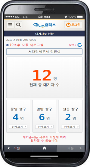 (조세금융신문=고승주 기자) 앞으로 모바일 홈택스 앱을 통해 세무서 민원실 대기자 수를 실시간으로 확인할 수 있게 된다.