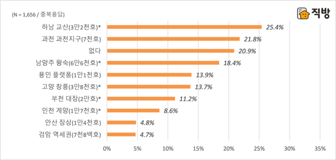 광역시 거주자도 이런 이유로 절반 이상이 청약 의사 지역이 '없다'라고 응답했으며, 이어 '남양주 왕숙>하남 교산'을 선택했다. 지방 거주자도 '없다' 응답이 가장 많았고, ‘과천 과천지구, 용인 플랫폼’이 청약 선호지역으로 꼽혔다.