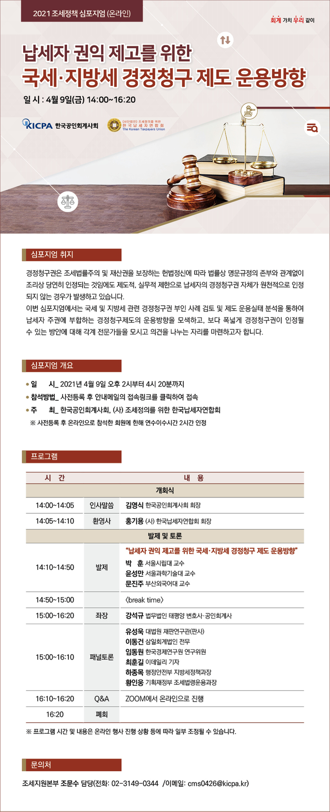 (조세금융신문=고승주 기자) 한국공인회계사가 내달 9일 오후 2시 온라인을 통해 납세자 권익 제고를 위한 ‘국세‧지방세 경정청구 제도 운용방안’을 주제로 2021 조세정책 심포지엄을 연다.