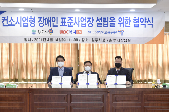 원주시는 14일 한국장애인고용공단 및 복지TV 강원방송과 컨소시엄형 장애인 표준사업장 설립을 위한 협약식을 가졌다.