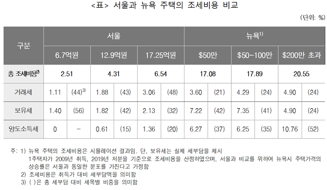 동일 기간 보유·처분한 뉴욕시 주택의 경우 조세비용이 취득가의 17~20%에 달하는 것에 비하면 높다고 말할 수 없는 셈이다.