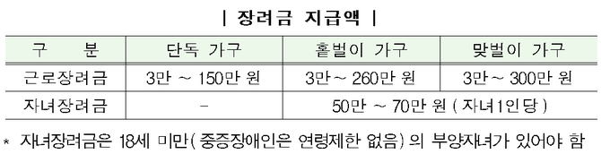 - 지급액은 본인과 배우자의 근로, 사업 또는 종교인 소득을 합한 ‘총급여액 등’을 장려금 산정표에 적용하여 결정한다.