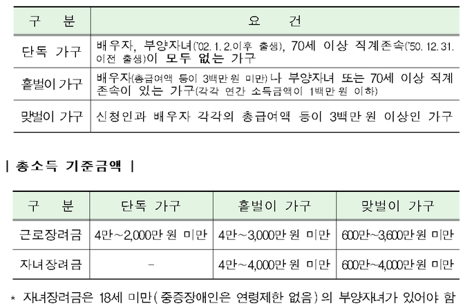 근로·자녀장려금은 가구별로 지급하므로 1가구에 1명만 신청할 수 있으며, 배우자・부양가족 유무에 따라 단독・홑벌이・맞벌이 가구로 구분해 장려금을 계산한다.