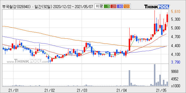 부국철강의 2020년 매출액은 전년대비 5.0% 늘어난 1389억원이고, 영업이익 또한 전년대비 459.4% 늘어난 18억원을 기록했다. 이 회사의 매출액 증감률과 영업이익 증감률은 각각 코스피 상위 28%, 상위 3%에 해당된다.