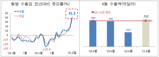 관세청에 따르면 4월 수출은 2개월 연속 500억 달러를 돌파하며 역대 4월 중 1위를 기록했고, 작년 동월 대비 41.2% 증가했다. 6개월 연속 증가한 가운데, 일평균 수출은 7개월 연속 증가했다.