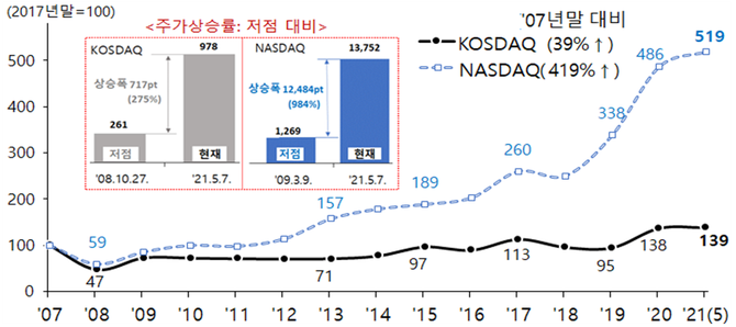 KOSDAQ·NASDAQ 지수 누적상승률(글로벌 금융위기 이후)