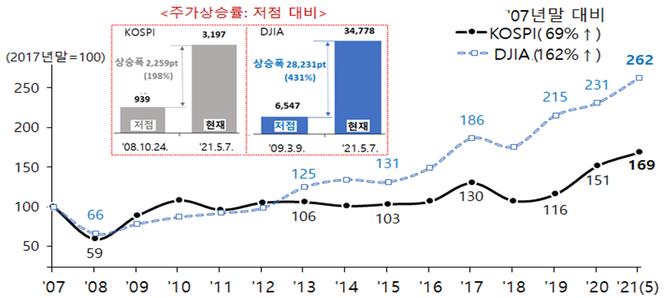 일례로, 개인투자자가 2007년에 KOSPI와 KOSDAQ 지수에 투자한 후 이듬해인 2008년 금융위기를 슬기롭게 넘기고, 올해 5월까지 양대 주가지수를 보유하고 있다고 가정하자. 투자자의 보유기간 수익률은 코스피가 69%, 코스닥이 39% 정도일 것이다. 코스피가 3,000 포인트를 넘었다 해도 증시버블을 우려할 만한 수준은 아니다.