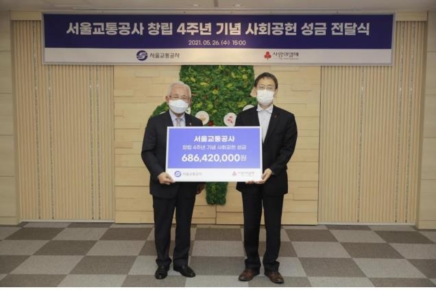 (조세금융신문=구재회 기자) 서울교통공사는 창립 4주년을 맞아 임직원 9천179명이 노사 공동으로 6억8천만원의 기부금을 모아 `사랑의열매' 사회복지공동모금회에 전달했다고 31일 밝혔다.