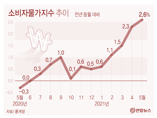 통계청이 내놓은 '5월 소비자물가 동향'에 의하면 지난달 소비자물가지수는 1년 전보다 2.6% 뛰어 약 9년여 만에 최고치를 찍었다. 지난달(2.3%)에 이어 연속 한국은행의 물가 관리 범위(2%)를 넘었다.