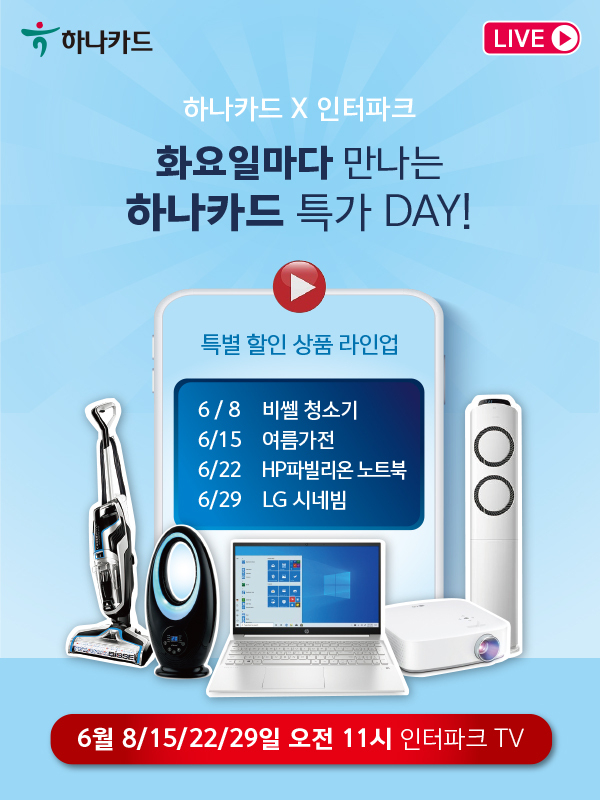 (조세금융신문=진민경 기자) 하나카드가 라이브커머스 채널 인터파크 TV와 함께 6월 한 달 간 매주 화요일 오전 11시 ‘하나카드DAY’ 라이브커머스 특가 방송을 진행한다고 7일 밝혔다.