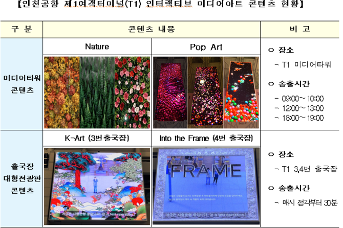 또한 인천공항 제1여객터미널 3층의 대형전광판 2개소(3번 출국장 인근 및 4번 출국장 인근 각 1개소)에서는 증강현실(AR) 기술을 이용해 여객이 미디어 콘텐츠 속에서 가상체험을 즐길 수 있는 작품인'K-Art'와 'Into the Frame'을 전시한다.
