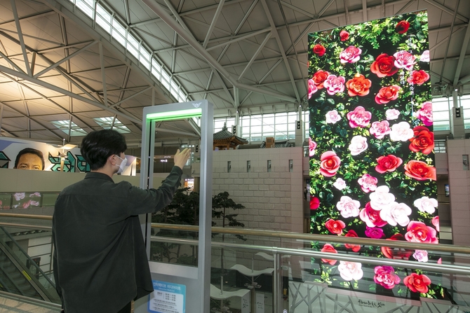 우선 제1여객터미널 중앙의 미디어타워에서는 3층 중앙에 별도로 마련된 센싱프레임에 관람객이 손을 넣으면 손의 움직임에 따라 미디어타워 속 화면이 실시간으로 반응하는 인터랙티브 콘텐츠인 'The Nature'와 'Pop Art'를 전시한다.