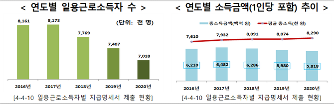 일용직 근로자 수는 전년대비 5.3%, 연간 총소득은 2.7% 각각 줄었다.