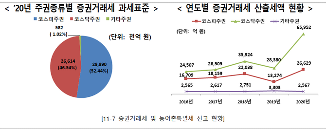 시장별 산출세액은 코스피주권이 2조6629억원, 코스닥주권은 6조5952억원으로 나타났다.