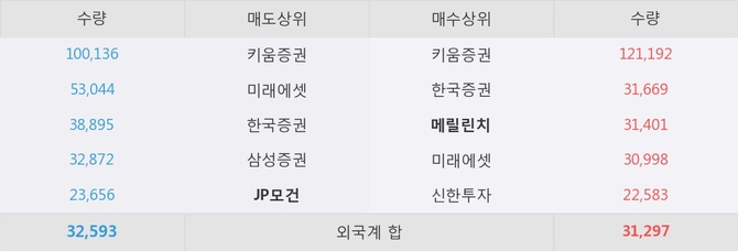 거래원 동향은 메릴린치, 미래에셋이 매수 상위 목록에 나타나고 있다. 한편, 매도 창구 상위에는 JP모건이 눈에 띄고 있다.