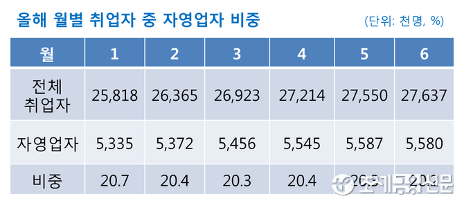 기존 최저치는 2019년 12월의 20.2%인데, 2019년 12월은 소수점 둘째 자리까지 하면 20.20%이고 올해 6월은 20.19%다. 자영업자 수는 고용원이 있는 자영업자와 고용원이 없는 자영업자의 합계다.