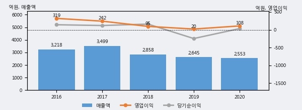 최근 3년간의 실적을 살펴보면, 매출액은 3년 연속 하락하고 있으나 그 하락폭은 줄어들고 있음을 알 수 있다.