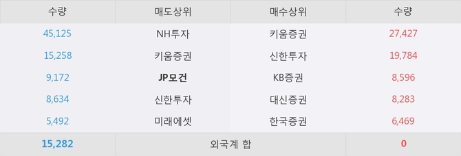 거래원 동향은 JP모건, NH투자, 미래에셋 등이 매도 상위 목록에 나타나고 있다.