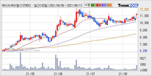 제이씨케미칼의 2020년 매출액은 전년대비 32.3% 늘어난 2677억원이고, 영업이익 또한 전년대비 48.0% 늘어난 192억원을 기록했다. 이 회사의 매출액 증감률과 영업이익 증감률은 각각 코스닥 상위 15%, 상위 30%에 해당된다.