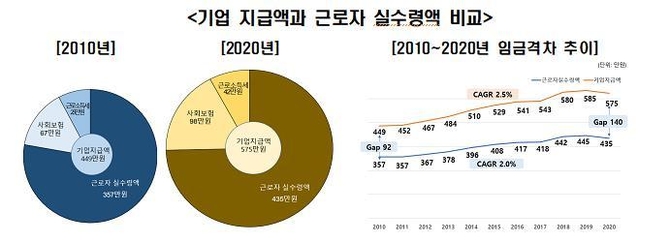 한경연에 따르면 2010년에는 기업이 임금 449만원을 지급하면 근로자는 사회보험료 67만원과 근로소득세 25만원을 합한 92만원을 제외하고 357만원을 수령했다.
