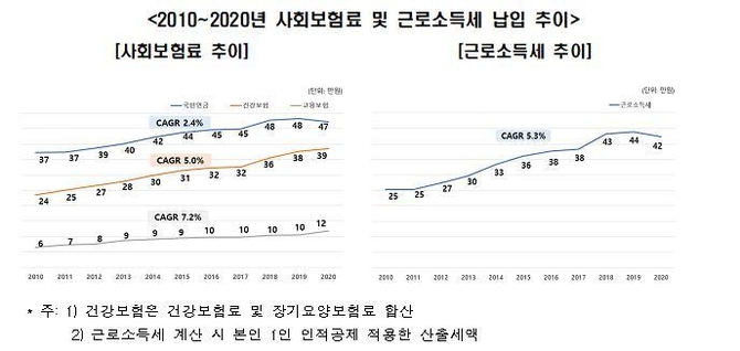 실제로 근로자 실수령액은 2010년 357만원에서 2020년 435만원으로 연평균 2.0% 증가했지만, 같은 기간 근로소득세는 5.3% 늘었다. 국민연금·건강·고용보험료도 각각 2.4%, 5.0%, 7.2%로 근로자 실수령액보다 더 가파르게 증가했다.