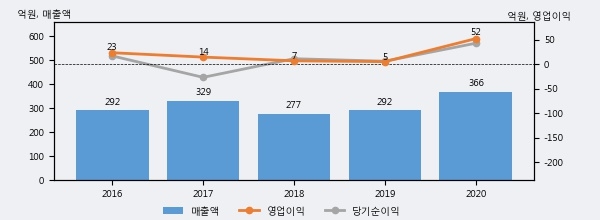 최근 실적을 살펴보면 2020년 매출액이 최근 5년 중 가장 높은 실적을 기록했음을 알 수 있다. 이전 최고 실적이었던 2017년 보다도 11.1%(36억 7천만원) 늘어난 것으로 나타났다.