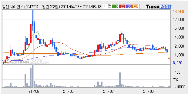 차트상 주가의 흐름은 중기 정배열 구간에서 상승해왔지만 근래에 많이 밀리면서 60일선까지 깨뜨리는 모습이다. 이 종목의 차트에서 최근에 이동평균밀집(5%이내) 등을 확인할 수 있다