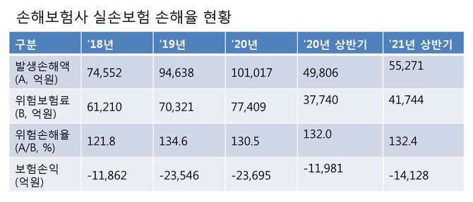 상반기 위험손해율(위험보험료 대비 보험금 지급액 비율)은 132.4%를 기록했다. 사업운영비를 포함한 보험료 전액, 즉 영업보험료를 기준으로 계산한 영업손해율은 위험손해율보다 10∼13%포인트(p) 낮은 점을 고려하면 영업손해율은 120∼123% 수준으로 추정된다.