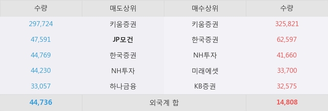 거래원 동향은 NH투자, 미래에셋 등이 매수 상위 목록에 나타나고 있다. 한편, 매도 창구 상위에는 JP모건이 눈에 띄고 있다.