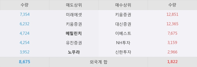 이 시각 주요 거래원은 NH투자, 키움증권, 대신증권 등이 매수 상위 창구에 자리하고 있다. 한편, 매도 창구 상위에는 메릴린치와 노무라가 눈에 띄고 있다.