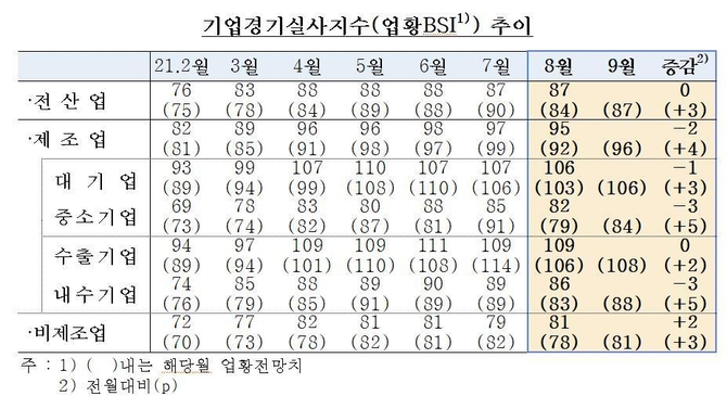 8월 실적이 아닌 9월 업황에 대한 전망 BSI지수(87)는 8월(84)보다 3포인트 올랐다. 제조업(96)과 비제조업(81)에서 각 4포인트, 3포인트 높아졌다.