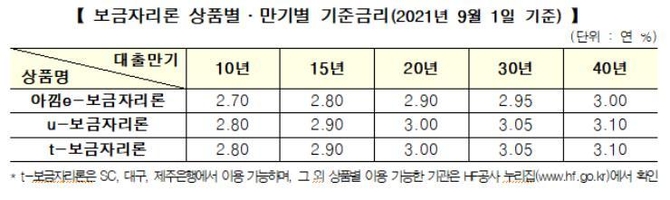 이에 따라 공사 웹사이트에서 신청하는 u-보금자리론과, 은행 창구에서 신청하는 t-보금자리론은 만기에 따라 연 2.80(10년)∼3.10%(40년) 금리가 만기까지 고정 적용된다.