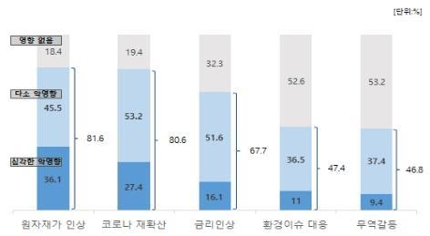 대한상공회의소는 30일 최근 국내 대기업 104개, 중소기업 206개 등 310개 사를 대상으로 설문조사한 결과 경제에 가장 큰 부담요인으로 '원자재가격 상승'(81.6%, 복수응답)과 '코로나 재확산(80.6%)', '금리인상(67.7%)'이 꼽혔다고 발표했다.