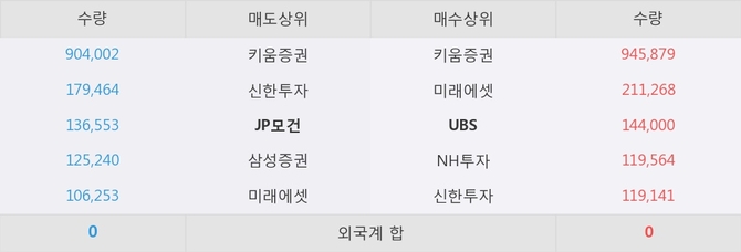 거래원 동향은 UBS, 미래에셋, NH투자 등이 매수 상위 목록에 나타나고 있다. 한편, 매도 창구 상위에는 JP모건이 눈에 띄고 있다.