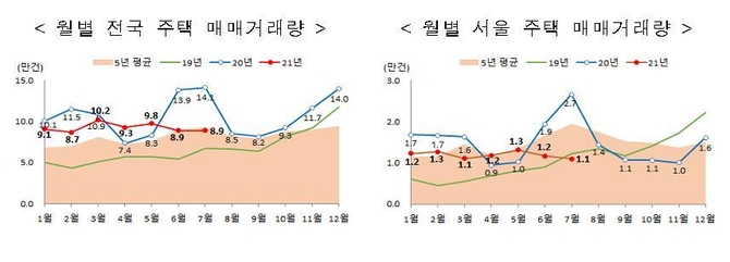 31일 국토교통부에 따르면 올해 7월 주택 매매량은 총 8만8천937건으로 작년 동월 14만1천419건 대비 37.1% 감소한 것으로 집계됐다. 지난 달 8만8천922건과 비교하면 거의 차이가 없다.