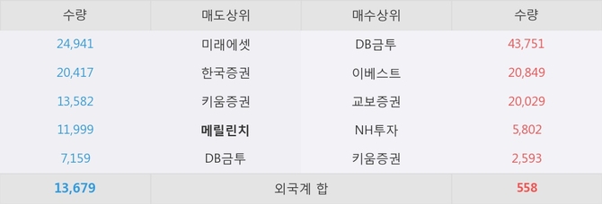 이 시각 주요 거래원은 NH투자, DB금투, 이베스트 등이 매수 상위 창구에 자리하고 있다. 한편, 매도 창구 상위에는 메릴린치가 눈에 띄고 있다.
