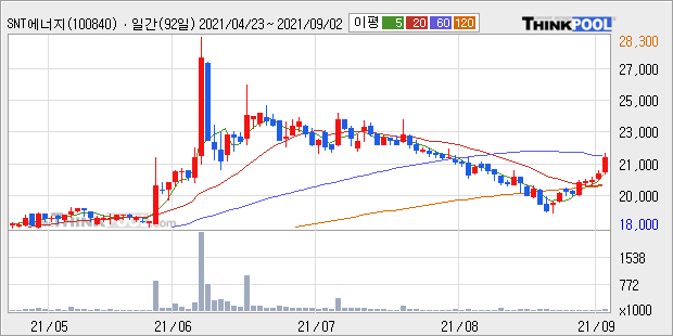 SNT에너지의 2020년 매출액은 전년대비 13.4% 늘어난 2300억원이고, 영업이익 또한 전년대비 54.7% 늘어난 227억원을 기록했다. 이 회사의 매출액 증감률과 영업이익 증감률은 각각 코스피 상위 17%, 상위 33%에 해당된다.