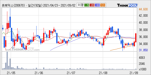 휴메딕스는 2020년 매출액 985억원과 영업이익 166억원을 기록했다. 전년대비 매출은 25.3%, 영업이익은 25.3% 각각 상승했다. 이 회사의 매출액 증감률과 영업이익 증감률은 각각 코스닥 상위 19%, 상위 38%에 해당된다.