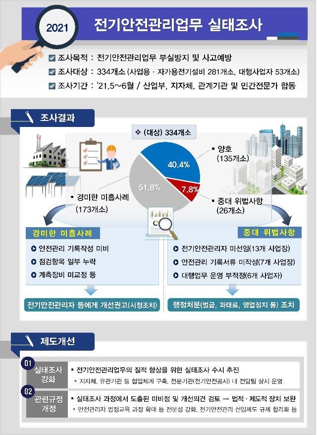 이들 사업장은 전기안전관리자를 선임하지 않거나, 안전관리 기록서류를 작성하지 않고 보전하지 않는 등의 위법 사례가 확인됐다. 산업부는 등록요건에 미달한 전기안전관리 대행사업자 2곳은 업무정지 처분을 내릴 예정이다. 행정처분 결과는 전기안전종합정보시스템에 공개한다.