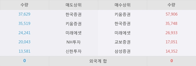 아직까지 외국계 증권사 창구를 통한 매매는 발생하지 않고 있다. 그리고 이 시간 한국증권이 매수창구상위에 올라있는 종목은 이 종목 이외에도 제일연마, 콜마비앤에이치 등이 있다.
