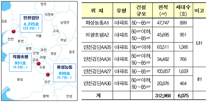 이번에 공모한 6개 사업지는 모두 아파트 택지다. ▲화성능동1A(4만7747㎡·899호) ▲의왕초평A2(4만5695㎡·951호) ▲인천검단AA26(6만3511㎡·1천366호) ▲인천검단AA31(3만4482㎡·766호) ▲인천검단AA27(10만657㎡·1629호) ▲인천검단AA30(2만876㎡·464호) 등 총 31만2968㎡, 6075가구 규모다.