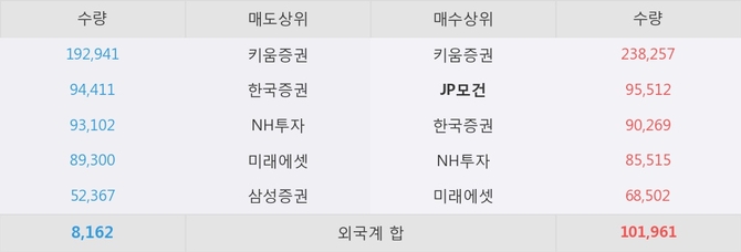 거래원 동향은 JP모건, NH투자, 미래에셋 등이 매수 상위 목록에 나타나고 있다.