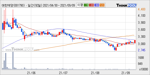 대한제당의 2020년 매출액은 전년대비 0.8% 늘어난 1조 2144억원이고, 영업이익 또한 전년대비 57.1% 늘어난 463억원을 기록했다. 이 회사의 매출액 증감률과 영업이익 증감률은 각각 코스피 상위 40%, 상위 24%에 해당된다.