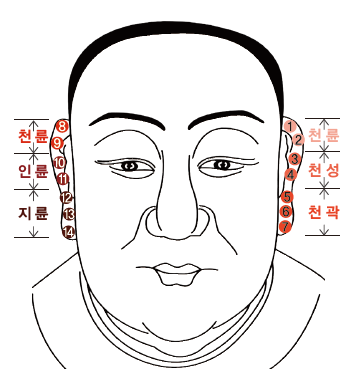 ● 귀는 팔학당(八學堂)중 문명학당(聞明學堂)이라 하고 귀바퀴가 넓으며 익은복숭아의 색깔이면 좋고 그러면서도 눈과 같이 하얀색이면 좋다.