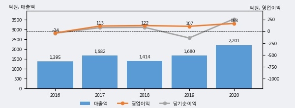 최근 실적을 살펴보면 2020년 매출액이 최근 5년 중 가장 높은 실적을 기록했음을 알 수 있다. 이전 최고 실적이었던 2017년 보다도 30.9%(519억 2천만원) 늘어난 것으로 나타났다.