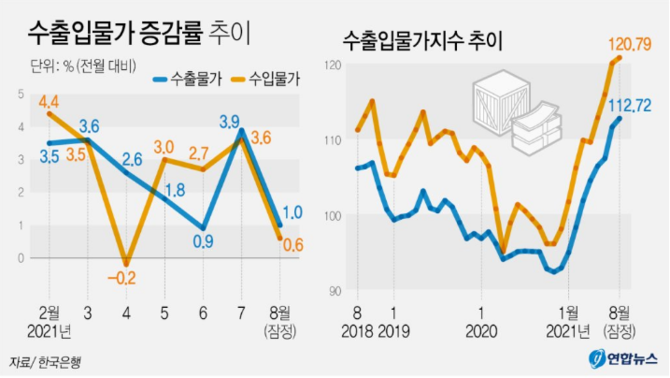 한국은행이 14일 발표한 수출입물가지수 통계에 따르면 8월 기준 수입물가지수(원화 기준 잠정치·2015년 수준 100)는 120.79로 7월(120.05)보다 0.6% 상승했다.