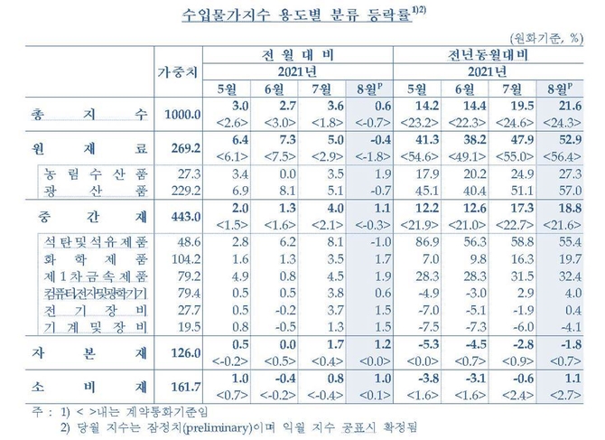 전월 대비 상승률을 품목별로 보면, 원재료 중 농림수산품(1.9%)은 올랐지만 광산품(-0.7%)이 떨어졌다. 중간재 가운데 1차금속제품(1.9%), 화학제품(1.7%)은 높아졌고, 석탄·석유제품(-1.0%)은 낮아졌다. 8월 국제 유가가 두바이유 기준으로 한 달 새 4.7% 하락한 영향이다.