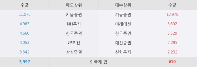 이 시각 주요 거래원은 미래에셋, 키움증권, 한국증권 등이 매수 상위 창구에 자리하고 있다. 한편, 매도 창구 상위에는 JP모건이 눈에 띄고 있다.