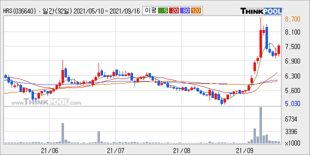 HRS의 2020년 매출액은 전년대비 1.0% 늘어난 674억원이고, 영업이익 또한 전년대비 551.9% 늘어난 103억원을 기록했다. 이 회사의 매출액 증감률과 영업이익 증감률은 각각 코스닥 상위 49%, 상위 4%에 해당된다.