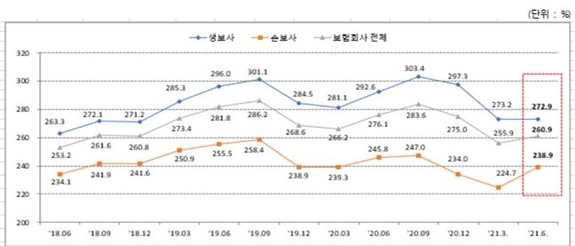 23일 금융감독원이 공개한 ‘2021년 6월말 기준 보험회사 RBC비율 현황’에 따르면 국내 보험사의 RBC비율은 260.9%로 지난 3월 대비 5%p 상승했다. 같은 기간 가용자본은 167조4000억원으로 지난 3월말에 비해 4조원 증가했다.